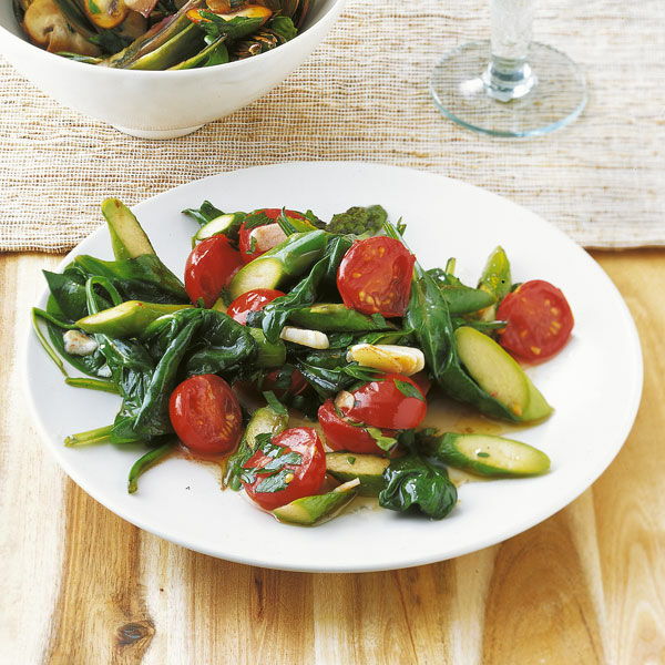 Den Spargel waschen und im unteren Drittel schälen, die Enden abschneiden. Die Spargelspitzen abschneiden, die Stangen leicht schräg in knapp 1 cm dicke Scheiben schneiden. Spinat verlesen, waschen, abtropfen lassen. Die Tomaten waschen und halbieren.