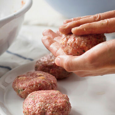 Den Frikadellenteig pikant abschmecken. Mit nassen Händen 12 kleine Fleischklöße formen und flach drücken, sodass die Frikadellen etwa 2 cm hoch werden.