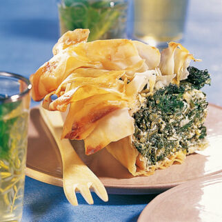 Die Spinatmischung auf die Teigblätter geben. Überstehende Teigränder nach innen schlagen und mit der restlichen Butter bestreichen. Die Pinienkerne darüberstreuen. Den Kuchen im heißen Ofen (unten, Umluft 200°) 10 Min. backen. Dann die Temperatur auf 200° (Umluft 180°) reduzieren und den Kuchen in ca. 15 Min. fertig backen.