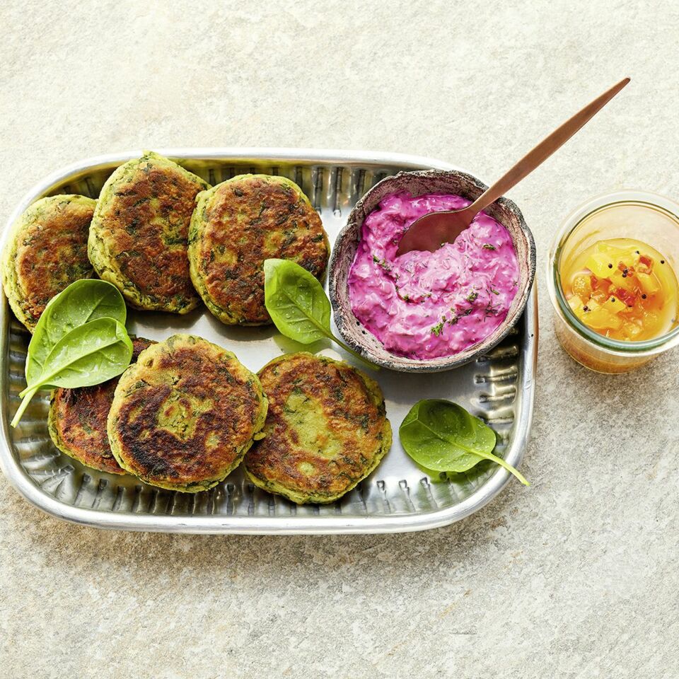Die Masse zu ca. zwölf golfballgroßen Kugeln formen, zu Bratlingen flach drücken und im übrigen Kichererbsenmehl wenden. Etwa 1 Std. kalt stellen. Danach das Öl in einer beschichteten Pfanne erhitzen. Tikkas darin in zwei Portionen pro Seite 4-5 Min. braten. Mit Rote-Bete-Raita (s. S. 56) oder Mango-Chutney (s. S. 59) servieren.