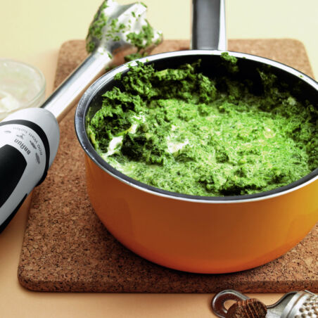 Inzwischen die Kräuter waschen, trocken schütteln und fein hacken. Unter die Spinatmasse rühren, 1 Min. mitkochen. Den Topf vom Herd nehmen, Frischkäse und Joghurt unterrühren und alles mit dem Pürierstab cremig pürieren. Eventuell nochmal erhitzen, aber nicht mehr kochen und mit Salz, Pfeffer und Muskatnuss würzen.