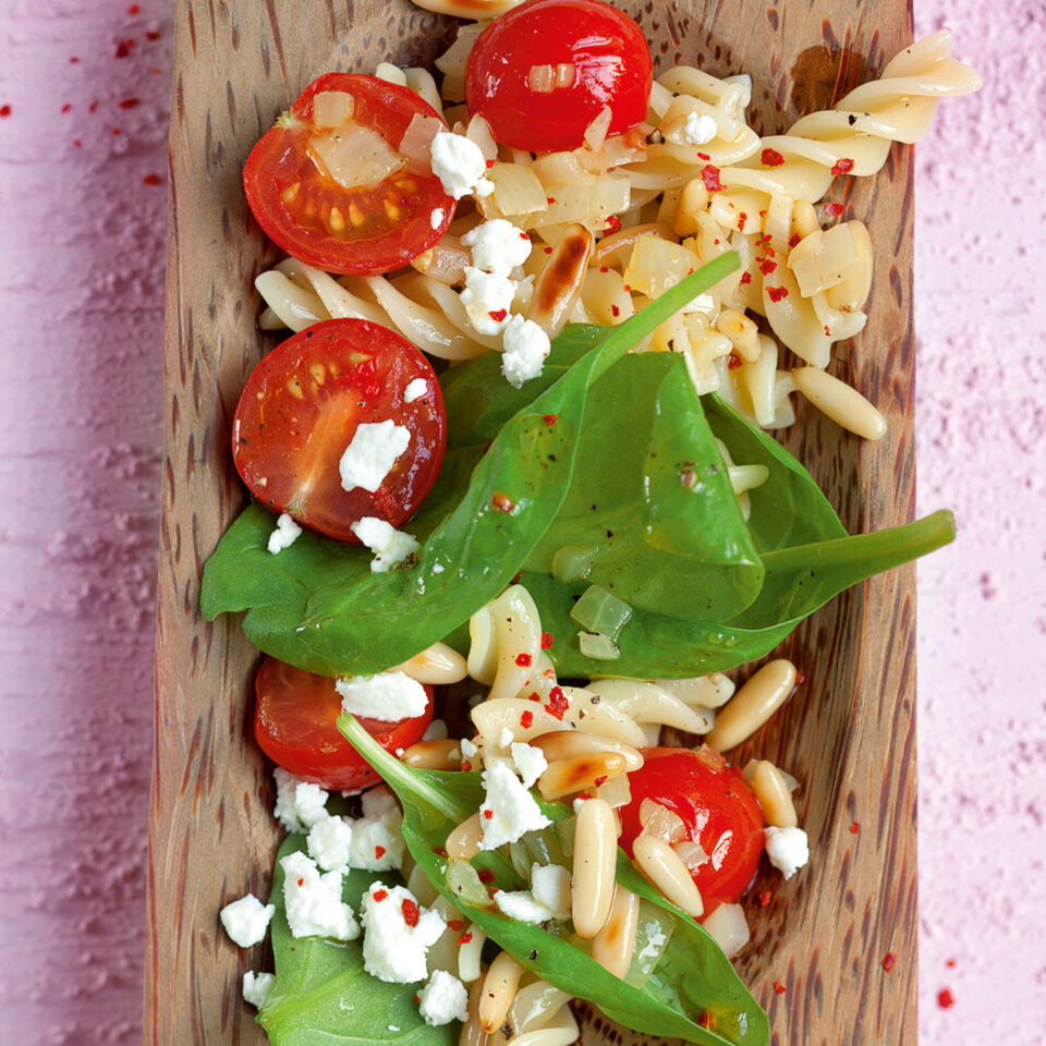 Nudeln in reichlich kochendem Salzwasser nach Packungsangabe garen. Inzwischen Zwiebel und Knoblauch schälen, fein würfeln. Tomaten waschen und halbieren. Spinat waschen, trocken schütteln. Ziegenkäse grob zerkrümeln.