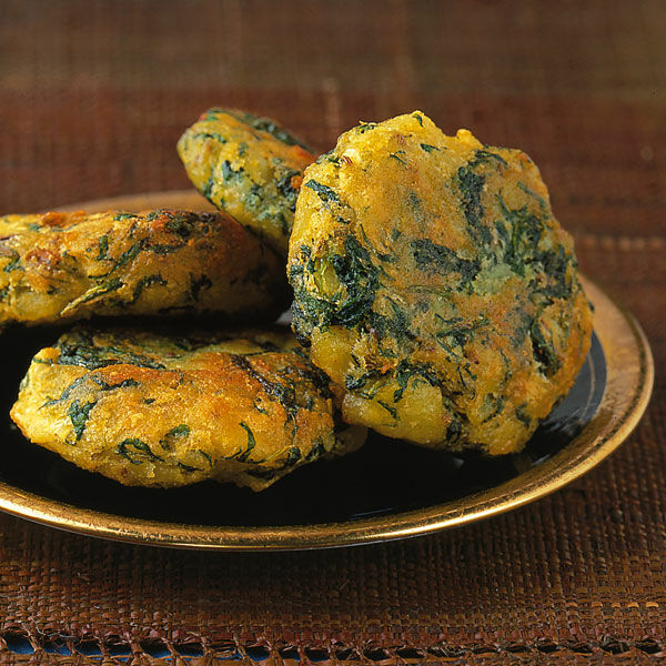 Die Kartoffeln abgießen, kalt abschrecken, pellen und in einer Schüssel fein zerdrücken. Chili, Spinat, Kichererbsenmehl, Ajwain und ca. ¾ TL Salz unterkneten. Aus der Masse 16 Kugeln formen und diese zu Pflänzchen flach drücken.