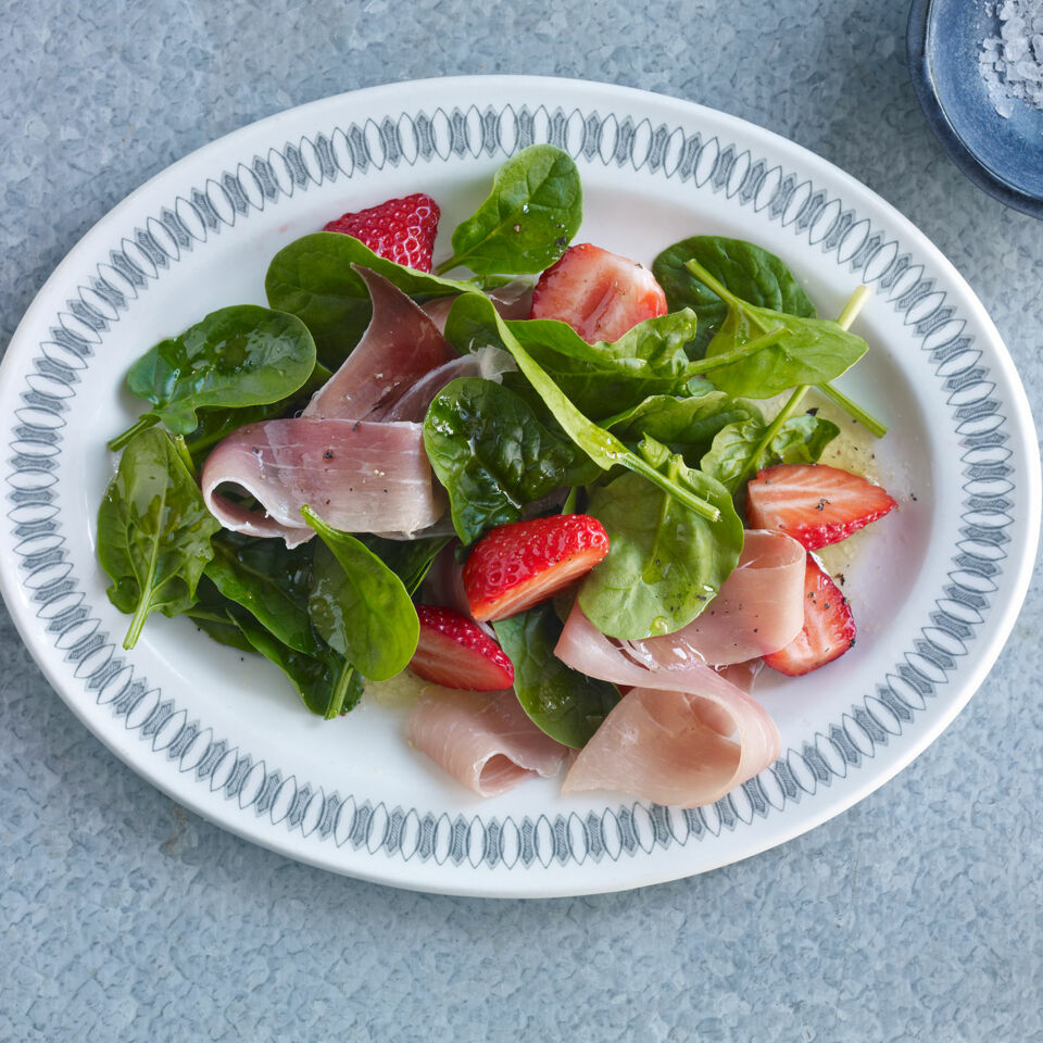 Spinatsalat mit Erdbeeren und Schinken
