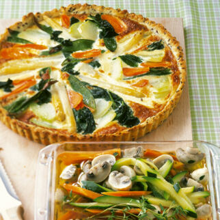 Den Teig ausrollen und in eine gefettete Springform (26 cm) legen. Mehrfach mit einer Gabel einstechen. Parmesan aufstreuen. Eier-Mix hineingießen und die gefrorenen Spinat-Minis gleichmäßig in den Teig drücken. Im Ofen (unten) ca. 30 Min. backen.