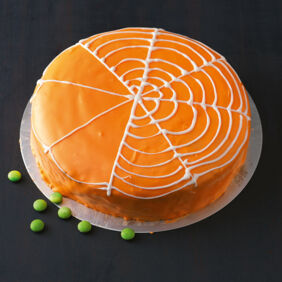 Für die Deko den Puderzucker mit Limettensaft in einer Schüssel zu einem dicken Guss verrühren, mit Speisefarbe nach Belieben orange einfärben. Den Guss auf den Kuchen geben und mit einer Palette gleichmäßig verstreichen, dabei auch den Rand bestreichen. Den Guss trocknen lassen.