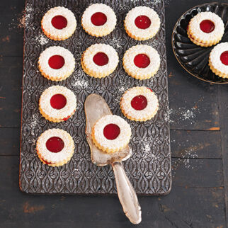 Das Gelee erwärmen und glatt rühren. Auf die größeren und mittleren Plätzchen jeweils etwas Gelee geben und immer drei Plätzchen terrassenartig aufeinandersetzen. Die fertigen Plätzchen mit Puderzucker bestreuen.