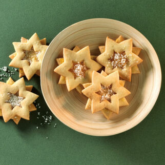 Den Backofen auf 165° (Umluft) vorheizen. Backpapier für mehrere Backbleche bereitlegen. Den Teig auf der bemehlten Arbeitsfläche ca. 4 mm dünn ausrollen, daraus in gleicher Anzahl Kreise und Ringe ausstechen und auf die Bleche setzen. Die Plätzchen im Ofen auf Sicht in 8-10 Min. goldgelb backen. Herausnehmen, mit dem Backpapier vom Blech ziehen und abkühlen lassen.