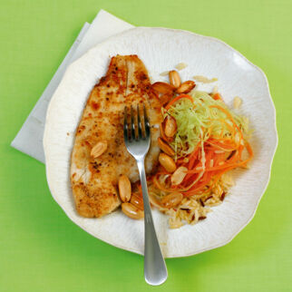 Inzwischen den Kohl putzen, vierteln und den Strunk herausschneiden, die Kohlviertel quer in sehr feine Streifen schneiden. In einer Schüssel mit 1 TL Salz bestreuen und mit den Händen 3 Min. kräftig durchkneten. Möhren putzen, schälen und raspeln oder auch in feine Streifen schneiden, mit dem Kohl mischen.