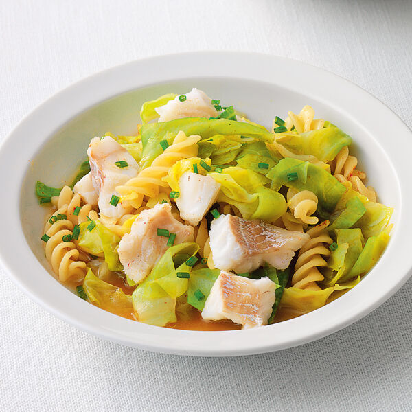Das Öl in einem Topf erhitzen, die Spitzkohlstreifen dazugeben und kurz rösten. Die Bouillon angießen und aufkochen lassen. Die Nudeln zugeben und in 10 Min. gar kochen. Die Fischstücke in den letzten 3 Min. zugeben und gar ziehen lassen.