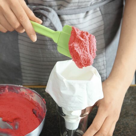 Vor dem Befüllen eine kleine Ecke von der Spritztüte abschneiden. Je nachdem, welche Füllung in die Tüte kommt und was man damit verzieren möchte, die Spitze kleiner oder größer abschneiden.