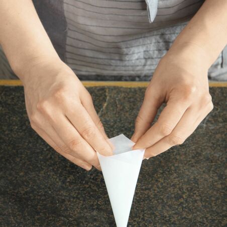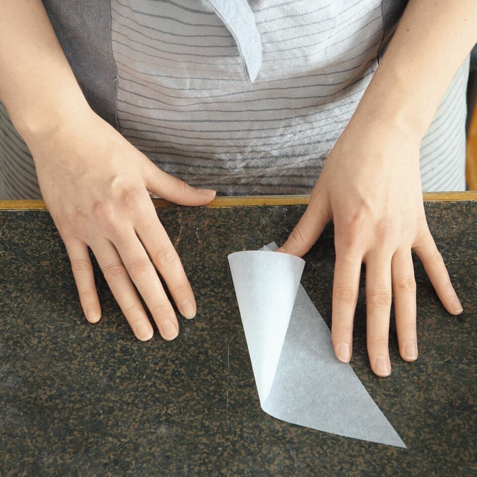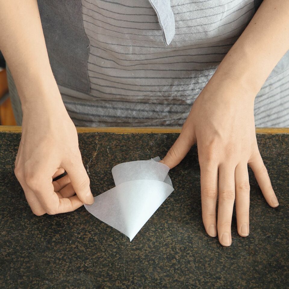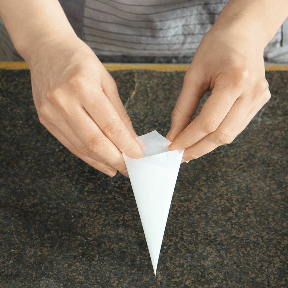 Anschließend die rechte und linke Spitze zu sich heranziehen und eine feste Spritztüte mit gut geschlossener Spitze formen. Zuletzt die beiden übereinanderliegenden Spitzen nach innen einschlagen, sodass eine gerade Seite entsteht.
