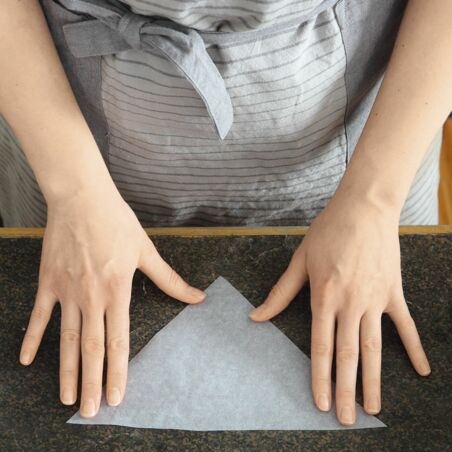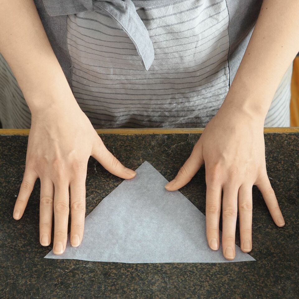 Spritztüten kann man ruck, zuck selber falten. Dafür aus einem Stück Backpapier (ca. 15 × 15 cm) ein gleichschenkliges Dreieck zuschneiden. Das Dreieck mit der Spitze nach unten auf die Arbeitsfläche legen.