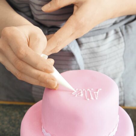 Der Spritzbeutel kann eine Herausforderung sein. So klappt das Befüllen: Zuerst die gewünschte Tülle in den Beutel legen, sodass die Spitze herausschaut. Den Beutel dann nach innen in die Tülle drücken, sodass diese verschlossen ist. Das ist vor allem für flüssige Spritzmassen wichtig. Manche Spritzbeutel haben auch Adapter, auf die man die Tülle einfach aufschraubt.