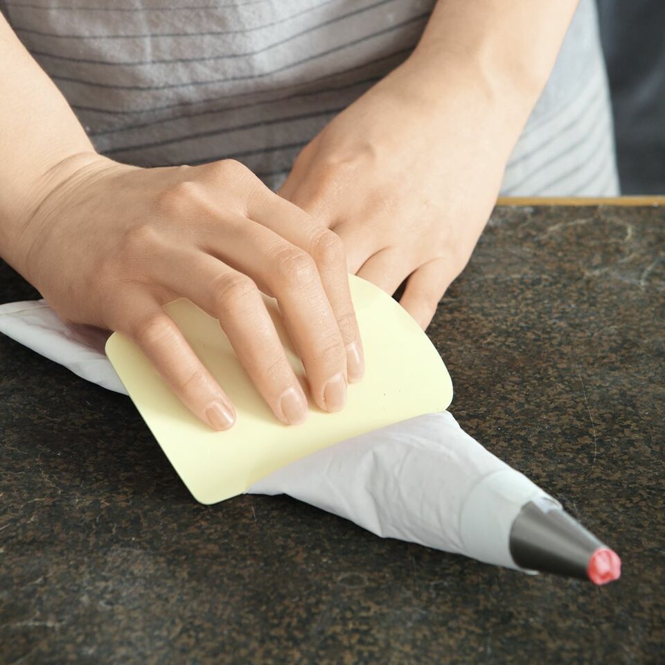 Nach dem Befüllen den Beutel wieder aus der Tülle ziehen und die Füllung mit einer Teigkarte in Richtung Tülle zusammenschieben. Das verhindert, dass in der Spritzmasse Luftblasen entstehen. Das Ende des Beutels zudrehen und loslegen. Um die Füllung nach unten zu drücken, den Beutel weiter zudrehen.