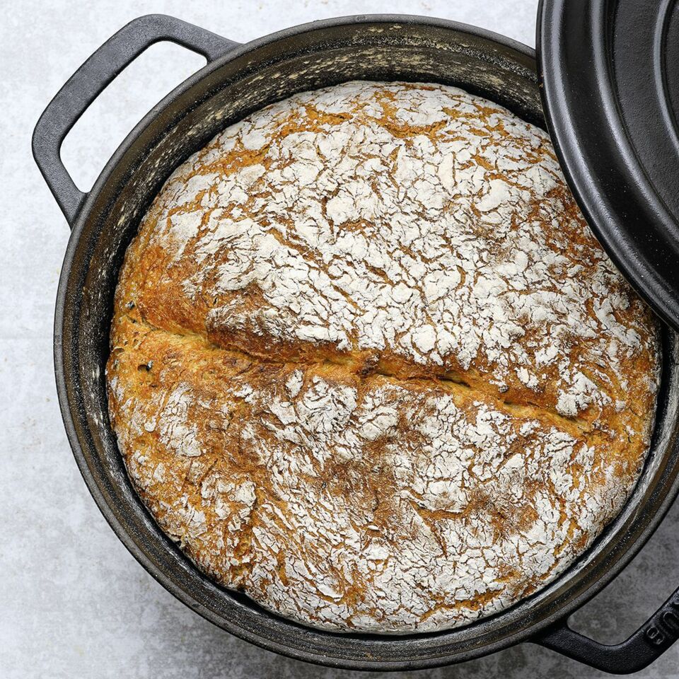 Den Teig mithilfe einer Teigkarte von der Schüssel lösen und in den Topf legen. Das Brot an der Oberfläche einmal längs ca. 1 cm tief einschneiden . Den Deckel wieder auflegen und das Brot im Ofen ca. 35 Min. backen. Den Deckel abnehmen und das Brot 5-10 Min. weiterbacken. Den Topf aus dem Ofen nehmen und das Brot darin auskühlen lassen.