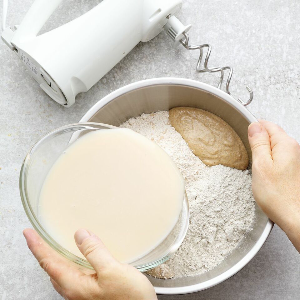 Beide Mehlsorten mit 2 TL Salz in der Rührschüssel der Küchenmaschine mischen. Die Hefe in 450 ml lauwarmes Wasser bröckeln. Den Honig dazugeben und alles verrühren, bis sich die Hefe aufgelöst hat.