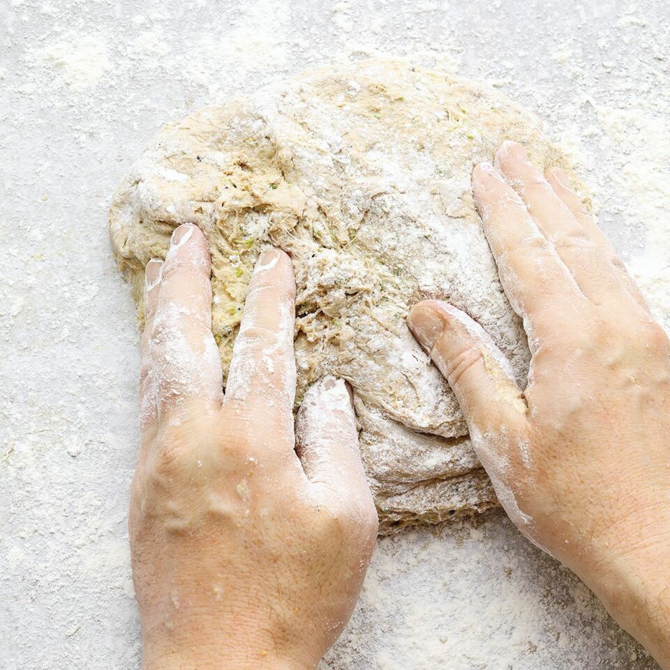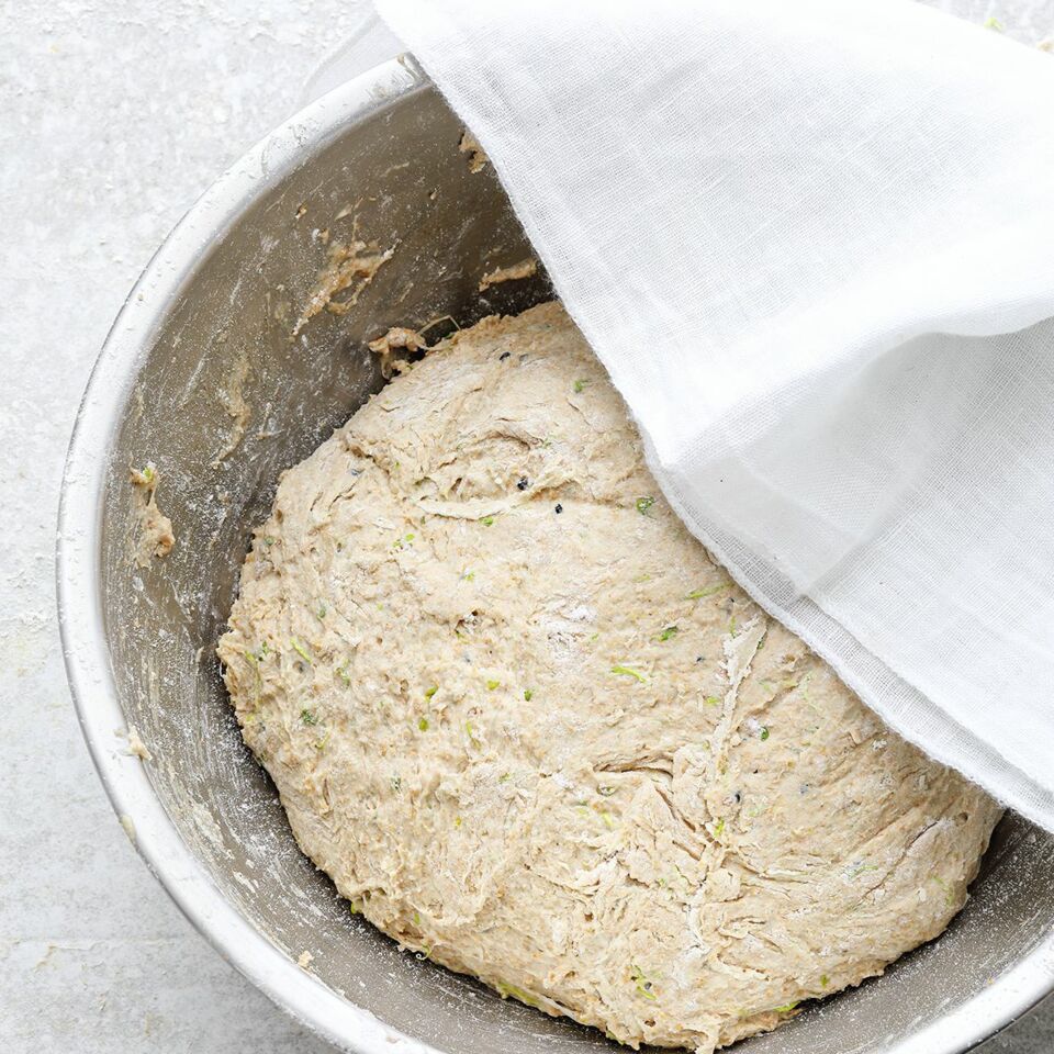 Hefewasser, Sauerteig und Aceto balsamico zur Mehlmischung geben und alles mit dem Knethaken der Küchenmaschine in ca. 2 Min. zu einem klebrigen Teig verkneten. Die Sprossen hinzufügen und nur kurz unterkneten. Den Teig auf der Arbeitsfläche mit bemehlten Händen noch kurz durchkneten, er sollte immer noch klebrig und feucht sein. Den Teig in eine Schüssel legen und abgedeckt bei Zimmertemperatur ca. 1 Std. gehen lassen.