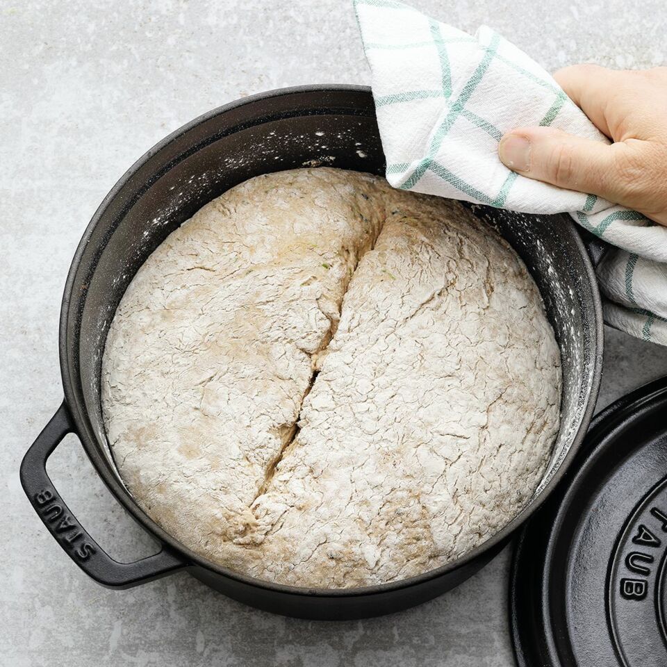 Kurz vor Ende der Gehzeit den Topf samt Deckel in den Backofen (2. Schiene von unten) stellen. Den Ofen auf 250 °C (Ober-/ Unterhitze) vorheizen. Den Topf aus dem Ofen nehmen und den Deckel abnehmen (Vorsicht, heiß!).