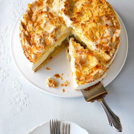 Für das Baiser die Eiweiße mit dem Zucker zu steifem Schnee schlagen. Die Hälfte des Eischnees auf dem Teig in der Backform verteilen und mit 50 g Mandelblättchen bestreuen. Den Boden im heißen Backofen (Mitte) ca. 20 Min. backen. Dann herausnehmen, 5 Min. abkühlen lassen, den Boden aus der Form und vom Backpapier lösen und mithlife eines Tortenhebers auf ein Kuchengitter legen. Darauf auskühlen lassen.