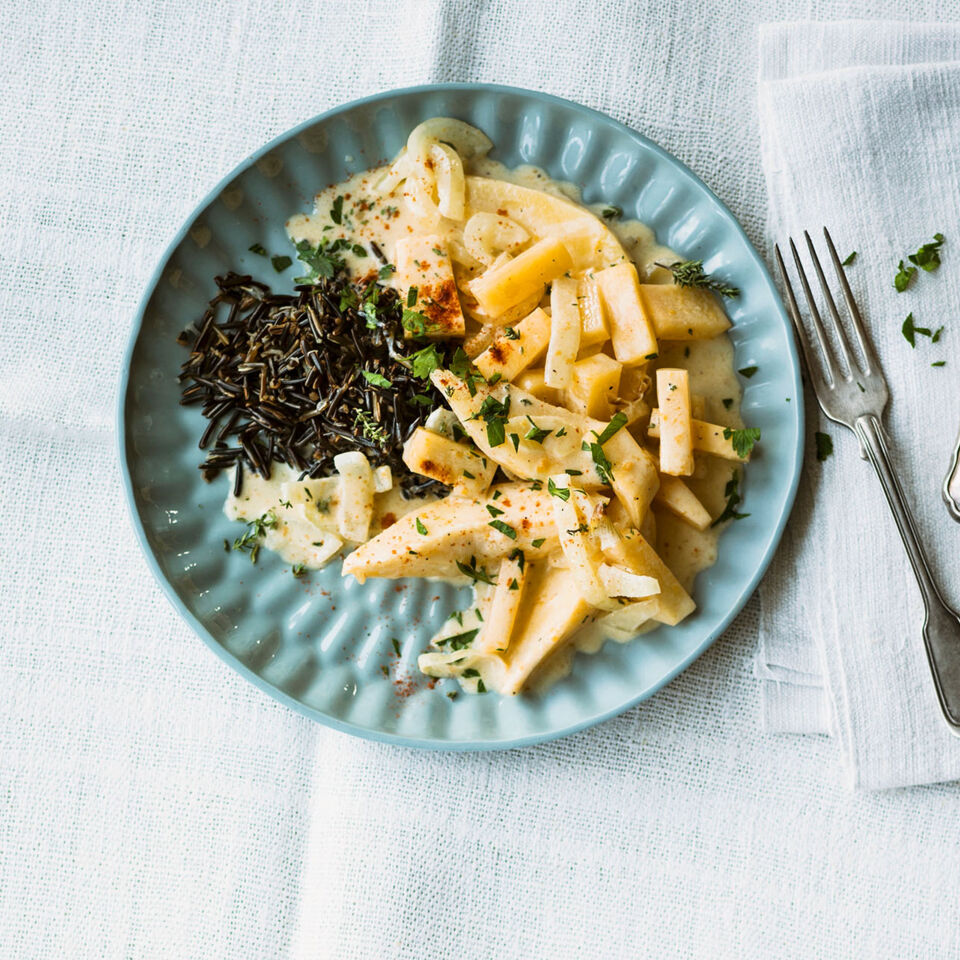 Überraschend gut, überrraschend anders. Steckrüben und Quitten ergänzen sich einfach wunderbar. Dazu passt Wildreis.