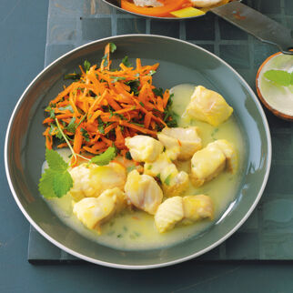 Den Ofen auf 200° (Umluft 170°) vorheizen. Spitzkohl putzen und waschen. Die Blätter quer zur Rippe in feine Streifen schneiden. Zwiebel und Knoblauch abziehen und klein würfeln. 1 EL Öl in einer Pfanne erhitzen und die Zwiebelwürfel darin unter Rühren 1 Min. anschwitzen. Kohl und Knoblauch dazugeben und unter Rühren 3 Min. anschwitzen. Mit Salz, Pfeffer und Ingwer würzen. Sahne dazugießen, aufkochen und den Kohl zugedeckt warm halten.