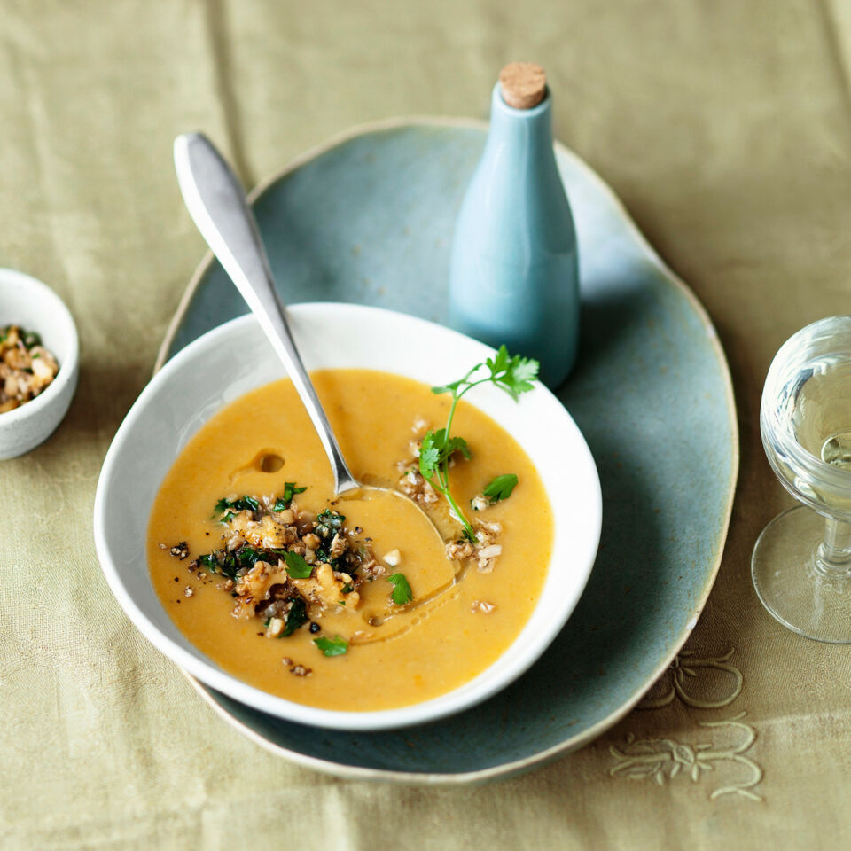 Raffiniert: Verteilen Sie auf jede Suppenportion etwas Champignon-Walnuss-Topping.