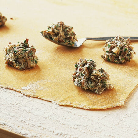 Die Hälfte des Teiges zu einem Quadrat von 40 × 40 cm ausrollen. Im Abstand von etwa 5 cm je 1 TL Füllung darauf geben. Das Eiweiß verschlagen. Den Teig damit zwischen der Füllung bepinseln. Restlichen Teig ausrollen, darüber legen und andrücken. Mit einem Teigrädchen (oder Messer) quadratische Teigtäschchen ausschneiden.