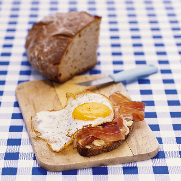Das Öl in einer Pfanne nicht zu heiß werden lassen, die Eier darin aufschlagen und in ca. 2 Min. zu Spiegeleiern braten. Sobald das Eiweiß fest ist, das Spiegelei mit dem Bratenschieber auf das Schinkenbrot legen. Nur leicht salzen und pfeffern, da der Schinken schon recht würzig ist, und warm servieren.