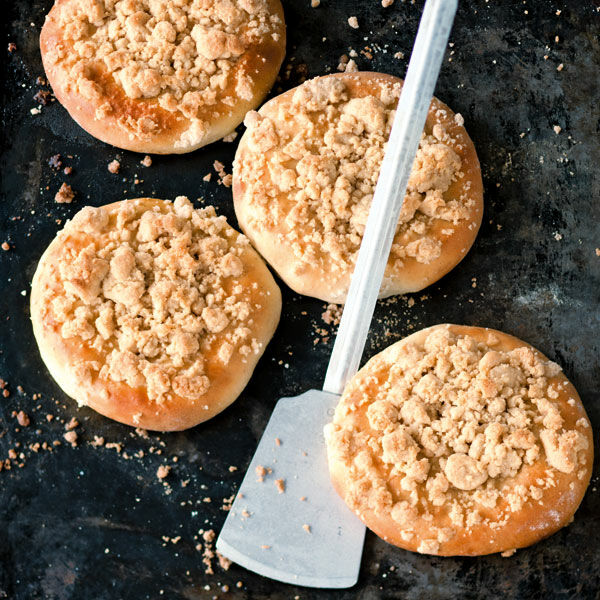 Den Teig kurz durchkneten und in acht gleich große Portionen teilen. Jede Portion auf der leicht bemehlten Arbeitsfläche zu einer Kugel formen, zu einem Teigfladen von ca. 10 cm Ø ausrollen und auf das Blech legen. Die Teigfladen mit der Milch bestreichen und die Streusel darauf verteilen. Weitere 15 Min. gehen lassen.