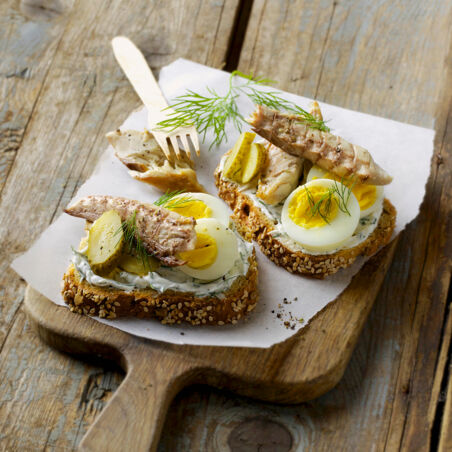 Wie wäre es mal wieder mit ein paar Scheiben Brot zum Abendessen? Natürlich fein belegt mit Quark, Makrele und Ei.