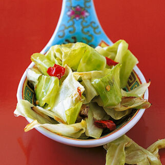 Einen Wok oder eine große Pfanne erhitzen. Das Öl hineingeben. Den Weißkohl und die Chilischoten darin 4 Min. pfannenrühren. Den Paksoi untermischen und unter Rühren 3 Min. mitbraten, dabei mit ein wenig Wasser beträufeln.