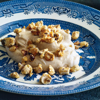 Die Maronen an der flachen Seite kreuzweise einschneiden und mit Salzwasser bedeckt bei mittlerer Hitze 40–45 Min. garen. Abgießen und schälen, dabei auch das dunkle Häutchen entfernen. Die Maronen noch heiß mit dem Pürierstab pürieren und ca. 30 Min. abkühlen lassen.