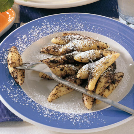 Die Kartoffelnudeln in die Mohnbutter geben. Vorsichtig umrühren und mit Puderzucker bestäubt servieren.