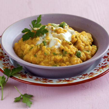 Die Süßkartoffeln abgießen und durch die Kartoffelpresse drücken. Pfeffer, Olivenöl, Ahornsirup, Soja-Joghurt und die Petersilie darunterrühren. Die Creme mit Salz und schwarzem Pfeffer abschmecken.