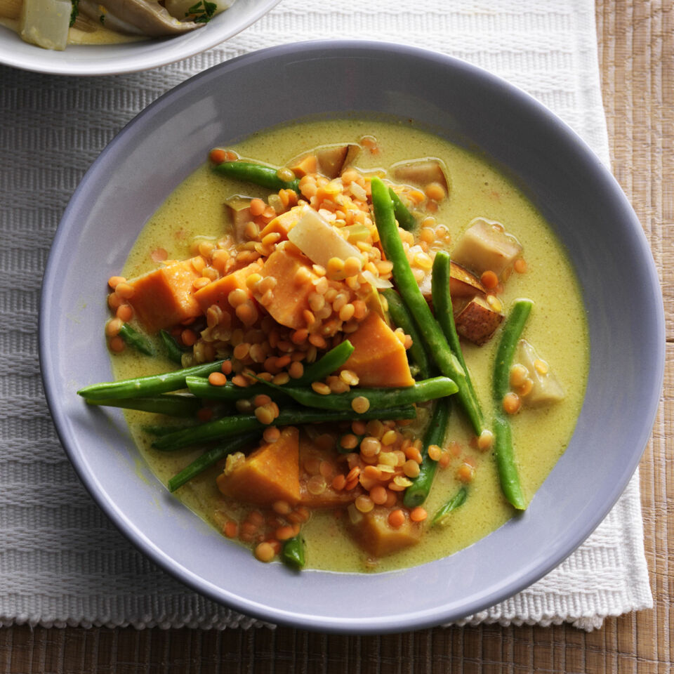 Ein Augen- und Gaumenschmaus ist dieses exotische Curry mit reichlich Kokosmilch und aromatischen Süßkartoffeln.