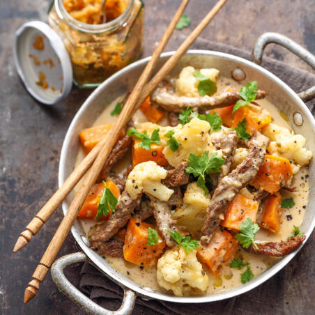 Die Süßkartoffeln schälen und in große Würfel schneiden. Den Blumenkohl putzen, in kleine Röschen teilen und waschen. Das Rindfleisch trocken tupfen und in Streifen schneiden. Das Öl in einem Topf erhitzen. Das Fleisch darin in ca. 2 Min. rundum kräftig anbraten, salzen, herausnehmen und zugedeckt beiseitestellen. Die Gewürzpaste in den Topf geben und unter ständigem Rühren ca. 1 Min. anbraten.