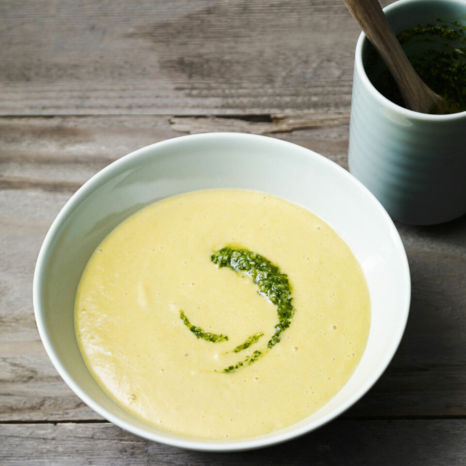 Der Klassiker Kartoffelsuppe wird hier mit Süßkartoffeln neu entdeckt. Das gewisse Extra an Würze und einen Farbtupfer bekommt die Suppe durch das Korianderpesto.