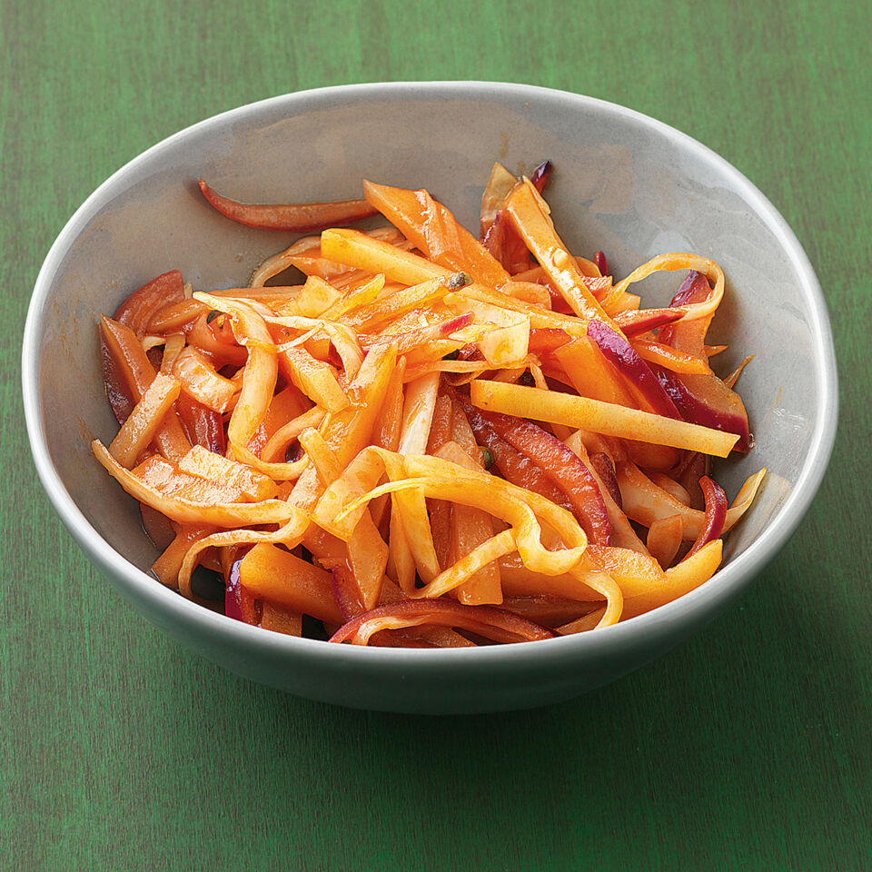 Kartoffeln schälen, waschen und erst in dünne Scheiben, dann in feine Stifte schneiden. Den Kohl waschen und in feine Streifen schneiden. Zwiebeln schälen, vierteln und auch in Streifen schneiden. Die Pfefferkörner grob hacken.