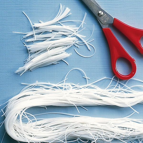 Die Frühlingszwiebel waschen, putzen und sehr fein schneiden. Den Knoblauch schälen und fein hacken. Beides mit dem Hackfleisch vermengen und mit Pfeffer, Salz und Zucker würzig abschmecken. Die Glasnudeln abgießen, in etwa 4 cm lange Stücke schneiden (Step 1) und mit der Hackfleischmasse verkneten.