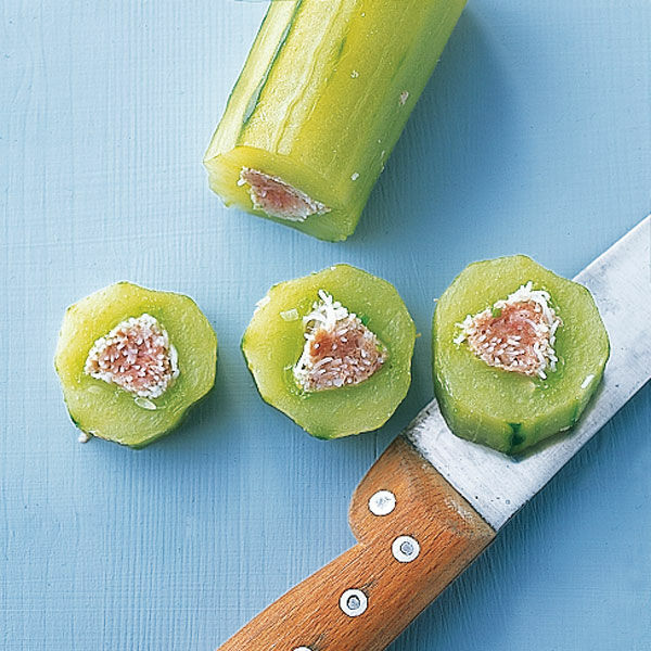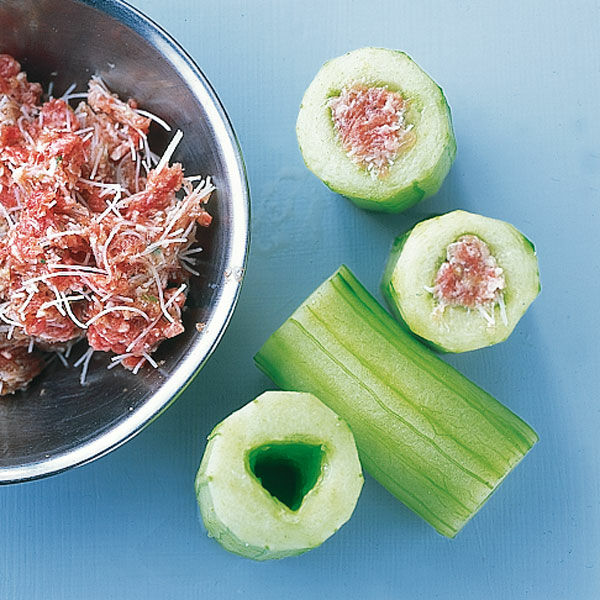 Gurken waschen, nach Geschmack schälen, die Enden abschneiden und jede Gurke in 3-4 Stücke schneiden. Samen und das geleeartige Fruchtfleisch mit einem Teelöffel herauskratzen. Die Hackfleischmasse in die ausgehöhlten Gurkenstücke füllen (Step 2) – das geht am besten mit den Fingern.