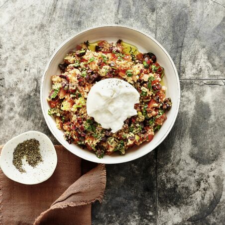 Couscous und 1 Prise Salz in einer Schüssel mit 50 ml kochendem Wasser übergießen. 5-10 Min. zugedeckt quellen lassen.