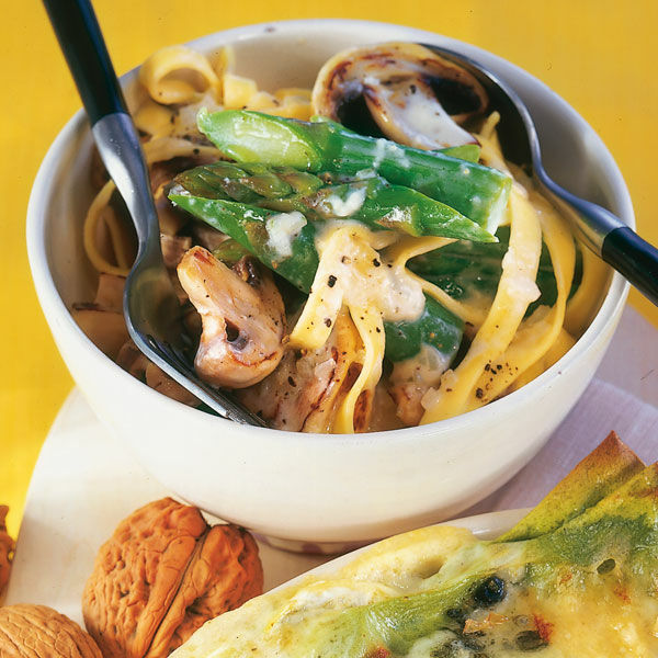 Die Nudeln mit Pilzen, Spargel, Sauce und dem Käse mischen und servieren.