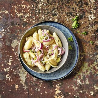 Pfifferlinge und Tagliatelle werden mit einem Kräuter-Knoblauch-Pesto zu einer schönen Alternative zum altbewährten Nudelsalat.
