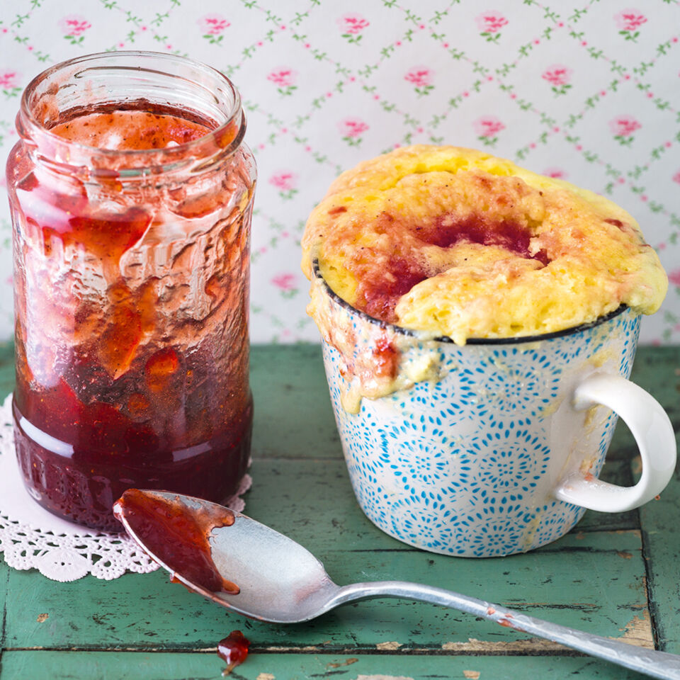 Fruchtig bunt und wunderbar wandelbar. Der leckere Tassenkuchen schmeckt mit jeder Lieblingsmarmelade - von Orange bis Himbeer.