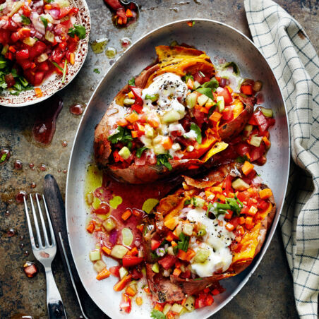 Sobald sich das Süßkartoffelfleisch beim Test mit einer Gabel weich anfühlt, die Süßkartoffeln aus dem Ofen nehmen und halbieren. Mit einem Messer mehrfach in die Kartoffelhälften stechen, das Fruchtfleisch lockern und jeweils 1 TL Öl darüberträufeln. Das Kartoffelfleisch mit der Gabel zu Püree drücken, ohne die Schale zu beschädigen, dann den Salat darauf verteilen. Als i-Tüpfelchen noch etwas Joghurt darüberlöffeln. Wer es gerne säuerlicher mag, beträufelt die Süßkartoffelhälften mit Zitronensaft.