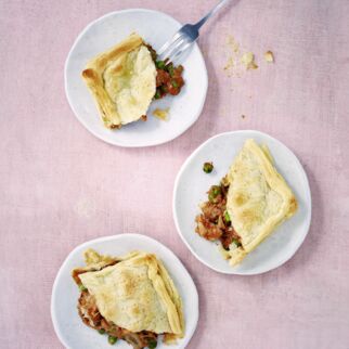 Die Skyr-Alternative mit dem Apfelessig glatt rühren. Den Koriander waschen, trocken schütteln und grob hacken. Salz und übrige Chiliflocken (½ TL) unterrühren. Zu den Teigschiffchen servieren.
