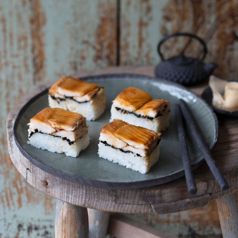 Es gibt auch Oshi-Formen mit Schlitzen, das erleichtert das Schneiden enorm. Wenn Sie keine Oshi-Form haben, legen Sie eine Plastikdose gleicher Größe mit Frischhaltefolie aus, schichten das Oshi hinein, drücken es mit einem Brettchen fest und stürzen es mithilfe der Folie aus der Form. Mit einem sehr scharfen, feuchten Messer schneiden.