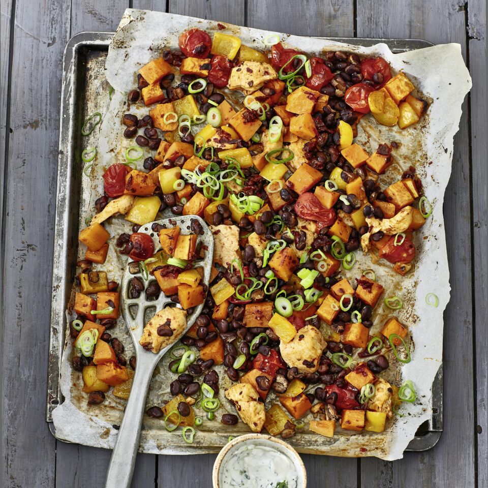 In einer Schüssel 40 g Chipotle mit dem Olivenöl verrühren, die Mischung mit Salz und Pfeffer würzen. Bohnen, Paprika, Süßkartoffeln und Hähnchen dazugeben und alle vermischen. Die Mischung auf dem Blech verteilen, die Tomaten dazwischen verteilen. Im Ofen (Mitte) ca. 25 Min. backen.