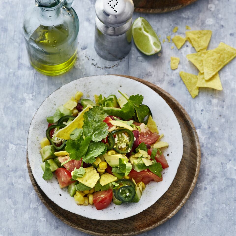 Koriandergrün waschen und trocken schütteln, die Blättchen mitsamt den zarten Stielen klein hacken. Die Hälfte des Korianders unter den Salat mischen. Den Tex-Mex-Salat auf zwei Teller oder Schalen verteilen. Mit dem übrigen Koriandergrün bestreuen und mit den Tortilla-Chips garnieren.